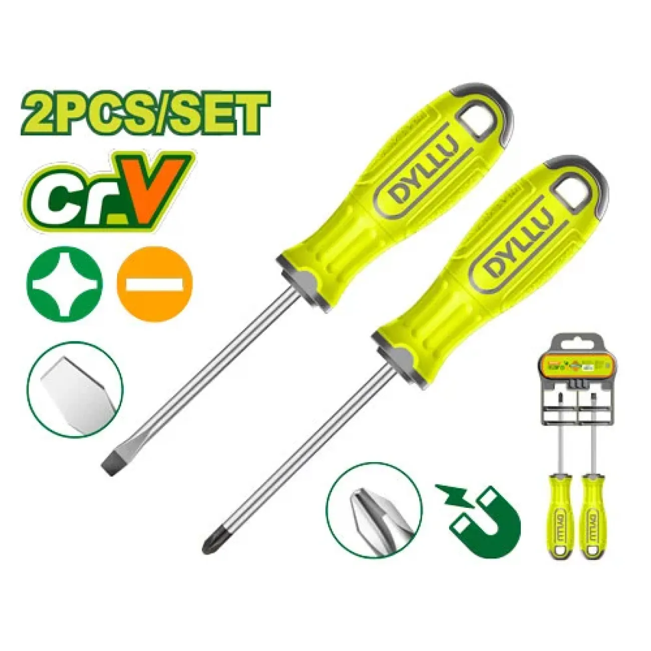 2 հատ պտուտակահանի հավաքածու Dyllu DTSS1302Հավաքածուն ունի 2 հատ պտուտակահան  հարմարավետ Էրգոնոմիկ բռնակով, բնիկի նյութը բարձր որակի մետաղից է և մագնիսով, որը թույլ է տալիս աշխատանքը կատարել արագ և որ...