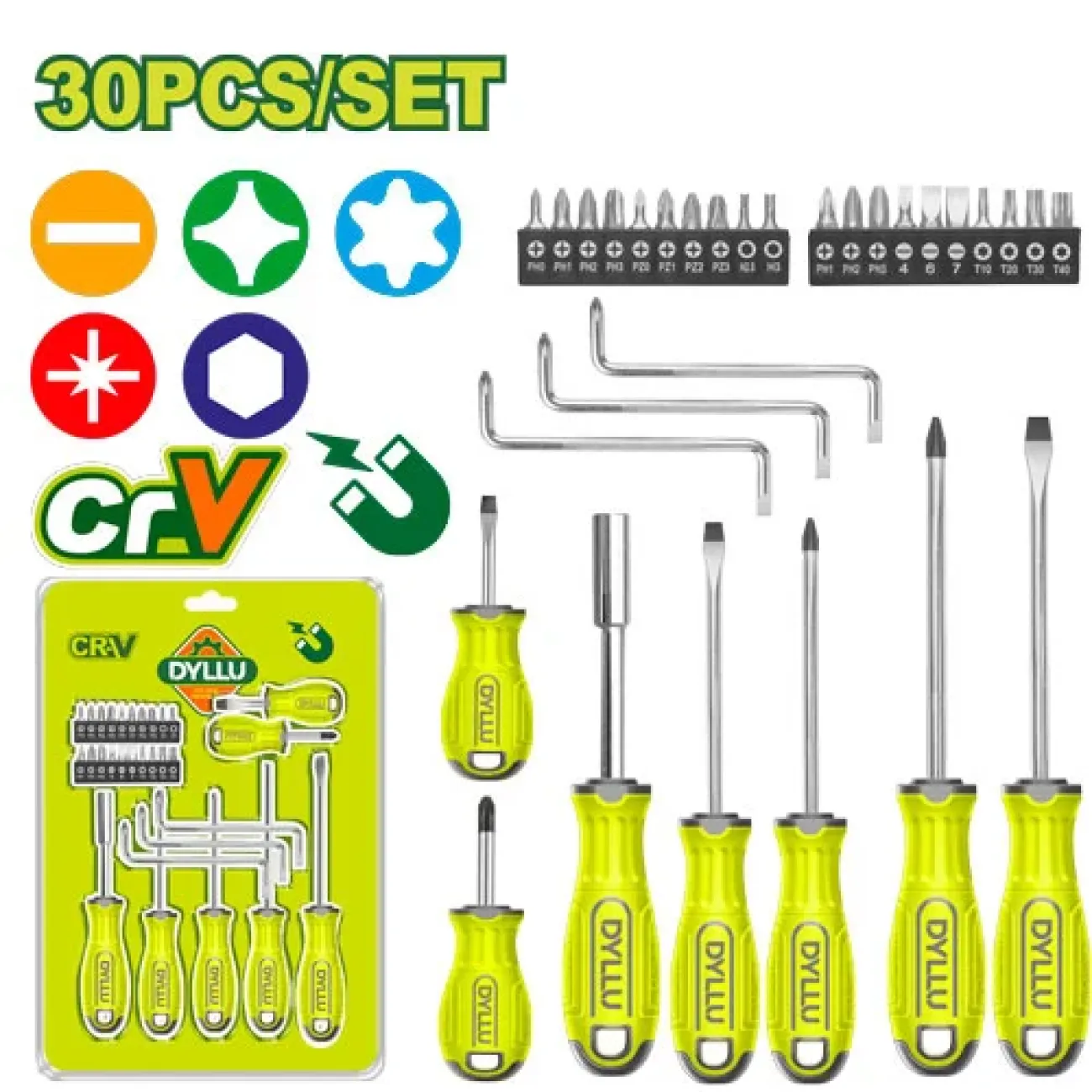 30 հատ պտուտակահանի հավաքածու Dyllu DTSS1430Հավաքածուն ունի 30 հատ պտուտակահան  հարմարավետ Էրգոնոմիկ բռնակով, բնիկի նյութը բարձր որակի մետաղից է և մագնիսով, որը թույլ է տալիս աշխատանքը կատարել արագ և ...