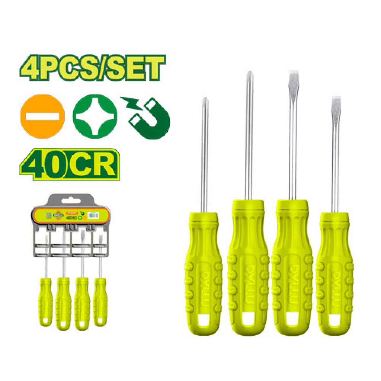 Հավաքածուն ունի 4 հատ պտուտակահան  հարմարավետ Էրգոնոմիկ բռնակով, բնիկի նյութը բարձր որակի մետաղից է և մագնիսով, որը թույլ է տալիս աշխատանքը կատարել արագ և որակով: