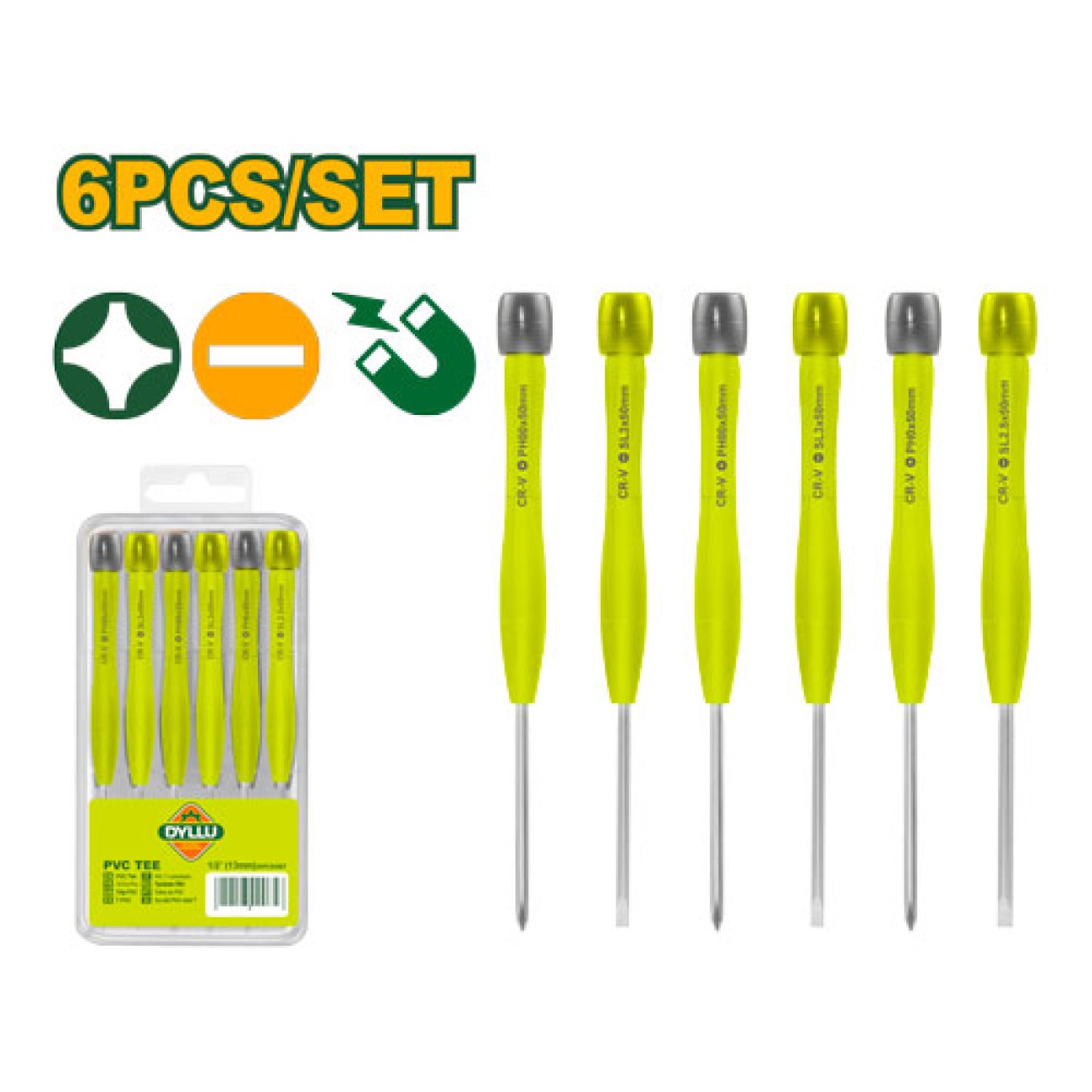 Հավաքածուն ունի 6 հատ ճշգրիտ պտուտակահան  հարմարավետ Էրգոնոմիկ բռնակով, բնիկի նյութը բարձր որակի մետաղից է և մագնիսով, որը թույլ է տալիս աշխատանքը կատարել արագ և որակով: