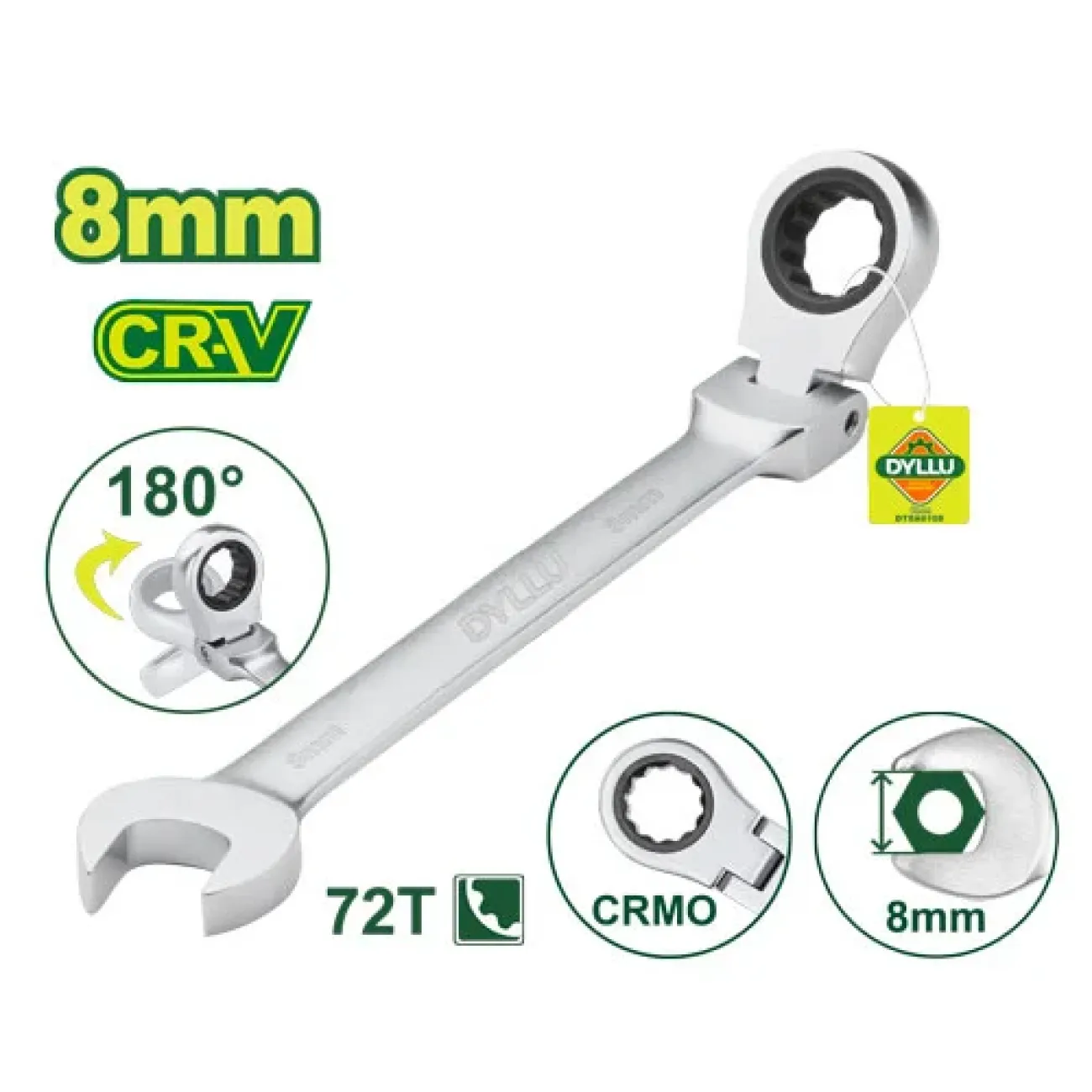 Ճկուն համակցված  բանալի ճռիկով 141 մմ Dyllu DTSA6108Համակցված  բանալի ճռիկով 8 մմԵրկարությունը՝ 141 մմՄարմնի նյութը՝ Cr-VԳլուխը կարող է պտտվել 180°Գլխի նյութը՝ CrMo RatchetDrop , կարծրացվածՔրոմապատ, ա...