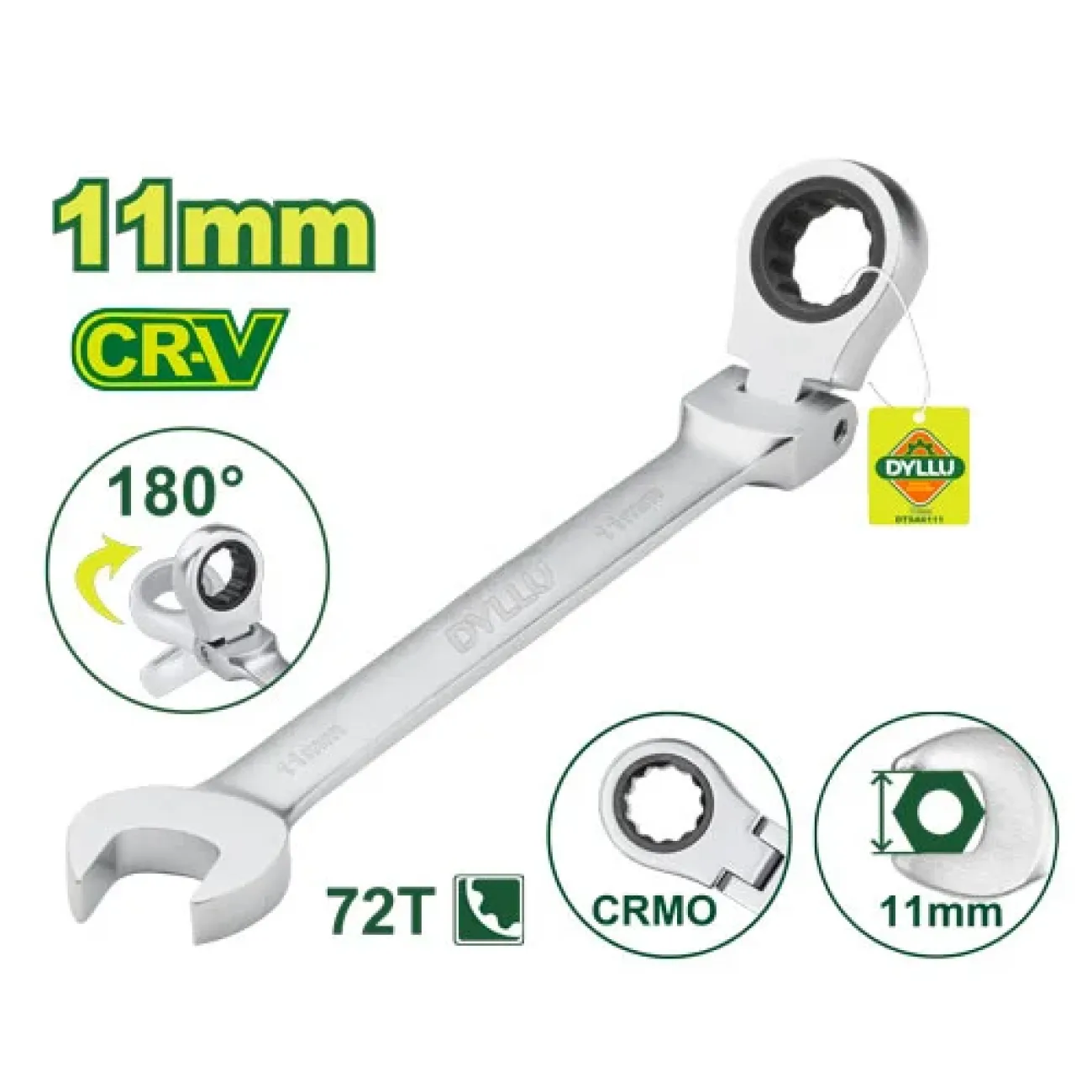 Ճկուն համակցված  բանալի ճռիկով 166 մմ Dyllu DTSA6111Համակցված  բանալի ճռիկով 11 մմԵրկարությունը՝ 166 մմՄարմնի նյութը՝ Cr-VԳլուխը կարող է պտտվել 180°Գլխի նյութը՝ CrMo RatchetDrop , կարծրացված...