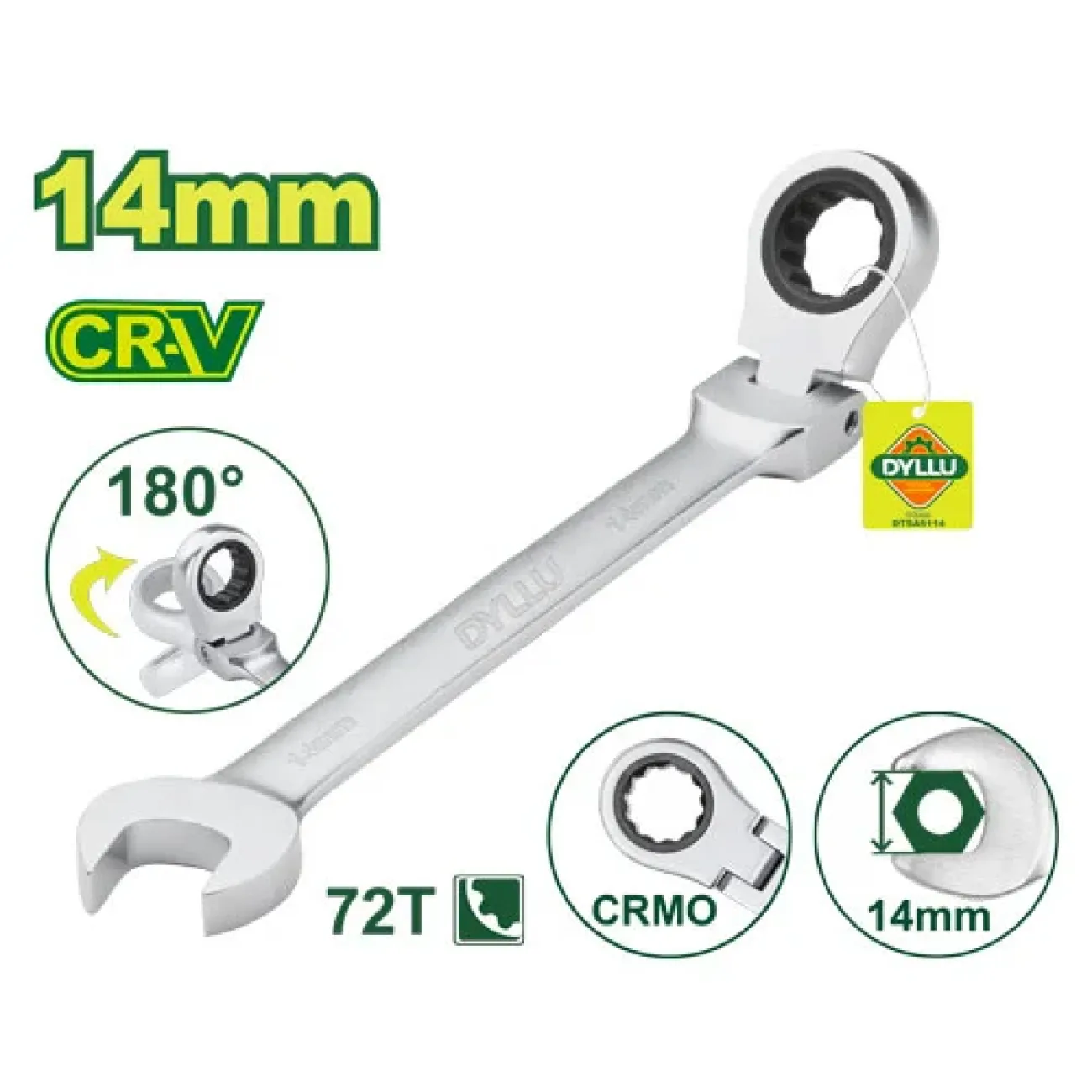 Ճկուն համակցված  բանալի ճռիկով 193 մմ Dyllu DTSA6114Համակցված  բանալի ճռիկով 14 մմԵրկարությունը՝ 193 մմՄարմնի նյութը՝ Cr-VԳլուխը կարող է պտտվել 180°Գլխի նյութը՝ CrMo RatchetDrop , կարծր...