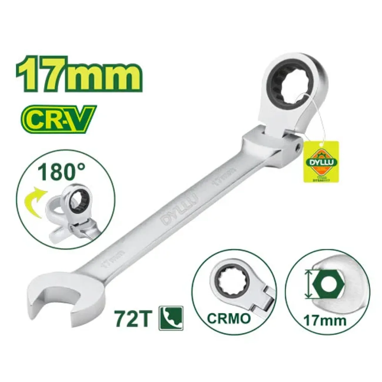 Ճկուն համակցված  բանալի ճռիկով 231 մմ Dyllu DTSA6117Համակցված  բանալի ճռիկով 17 մմԵրկարությունը՝ 231 մմՄարմնի նյութը՝ Cr-VԳլուխը կարող է պտտվել 180°Գլխի նյութը՝ CrMo RatchetDrop , կարծր...