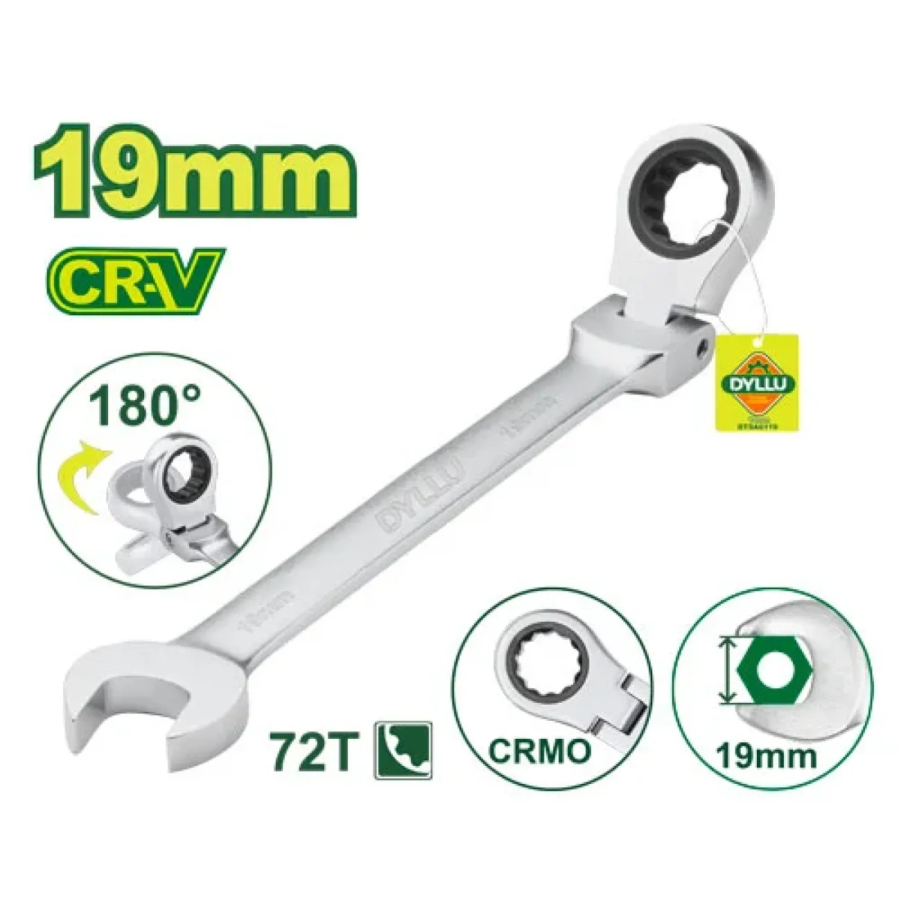 Ճկուն համակցված  բանալի ճռիկով 252 մմ Dyllu DTSA6119Համակցված  բանալի ճռիկով 19 մմԵրկարությունը՝ 252 մմՄարմնի նյութը՝ Cr-VԳլուխը կարող է պտտվել 180°Գլխի նյութը՝ CrMo RatchetDrop , կարծր...
