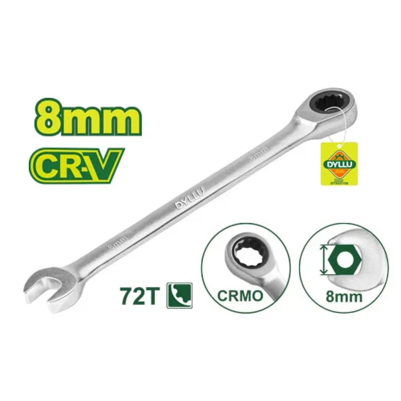 Համակցված  բանալի ճռիկով 140 մմ Dyllu DTSA5108Համակցված  բանալի ճռիկով 8 մմԵրկարությունը՝ 140 մմՄարմնի նյութը՝ Cr-VԳլխի նյութը՝ CrMo RatchetDrop , կարծրացվածՔրոմապատ, անփայլ ծածկույթՓաթեթավորված թղթե ...