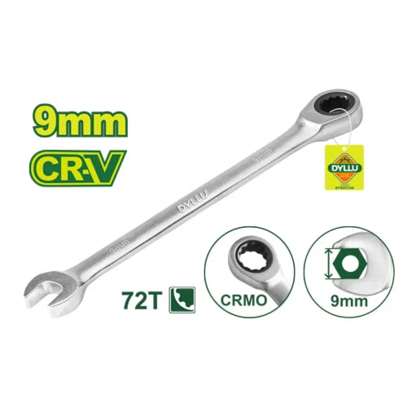 Համակցված  բանալի ճռիկով 150 մմ Dyllu DTSA5109Համակցված  բանալի ճռիկով 9 մմԵրկարությունը՝ 150 մմՄարմնի նյութը՝ Cr-VԳլխի նյութը՝ CrMo RatchetDrop , կարծրացվածՔրոմապատ, անփայլ ծածկույթՓաթեթավորված թղթե ...