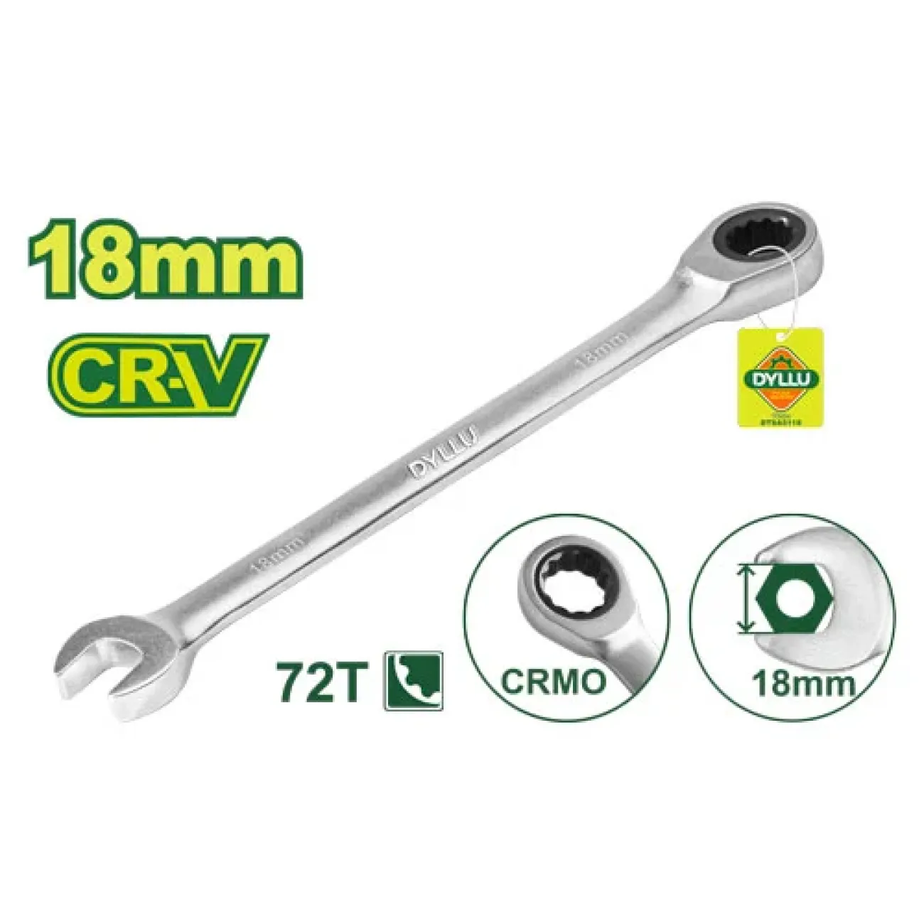 Համակցված  բանալի ճռիկով 230 մմ Dyllu DTSA5118Համակցված  բանալի ճռիկով 18 մմԵրկարությունը՝ 230 մմՄարմնի նյութը՝ Cr-VԳլխի նյութը՝ CrMo RatchetDrop , կարծրացվածՔրոմապատ, անփայլ ծածկույթՓա...