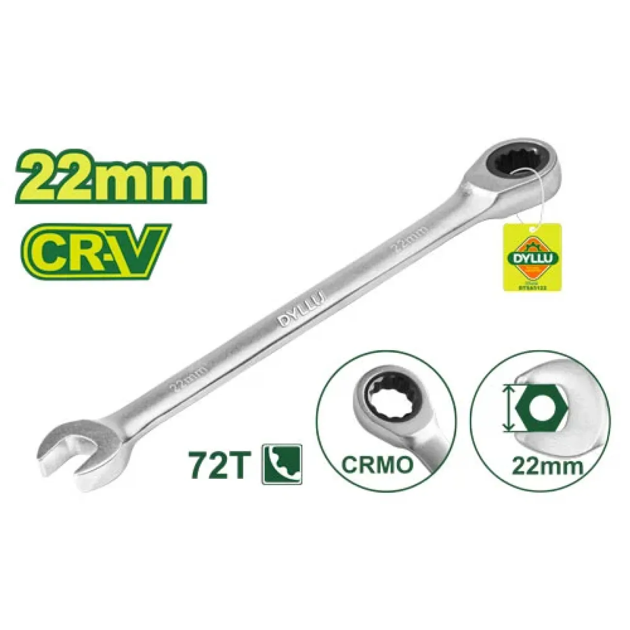 Համակցված  բանալի ճռիկով 287 մմ Dyllu DTSA5122Համակցված  բանալի ճռիկով 22 մմԵրկարությունը՝ 287 մմՄարմնի նյութը՝ Cr-VԳլխի նյութը՝ CrMo RatchetDrop , կարծրացվածՔրոմապատ, անփայլ ծածկույթՓա...