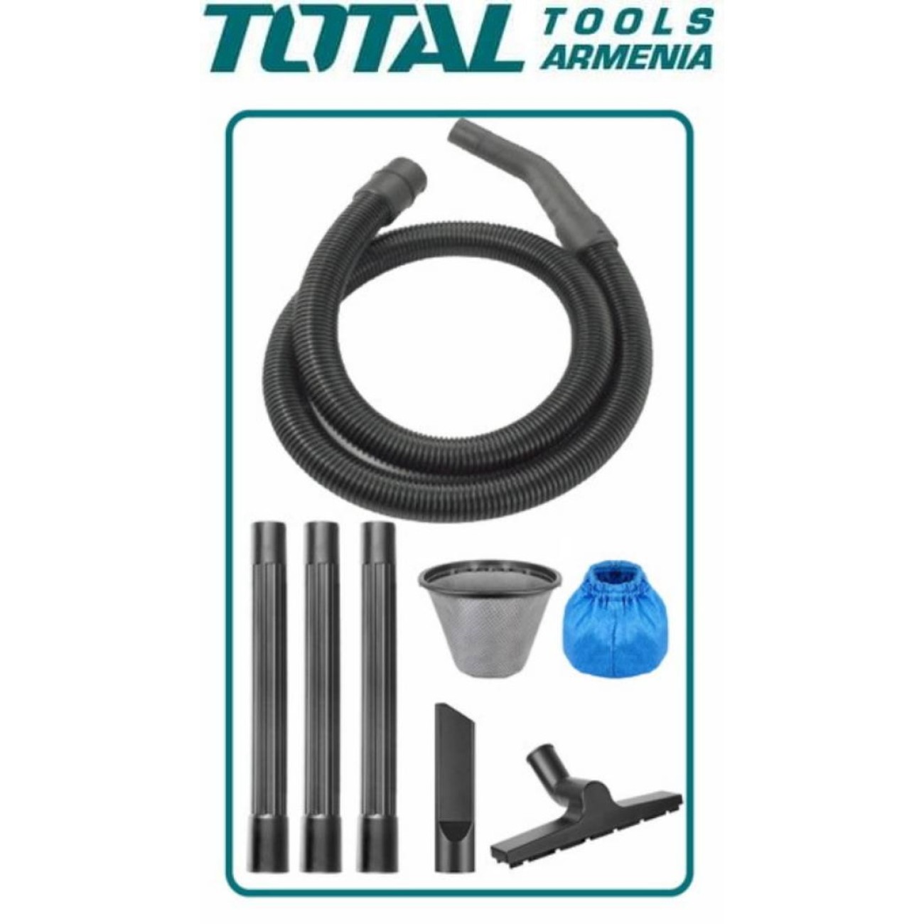 ներծծող խողովակ 1․5 մ - 1 հատ, Գործվածքի ֆիլտր - 1 հատ, Փրփուրի ֆիլտր - 1 հատ, Ճեղքային վարդակ 2-ը 1-ում - 1 հատ, գլխիկ գորգերի համար - 1 հատ:
