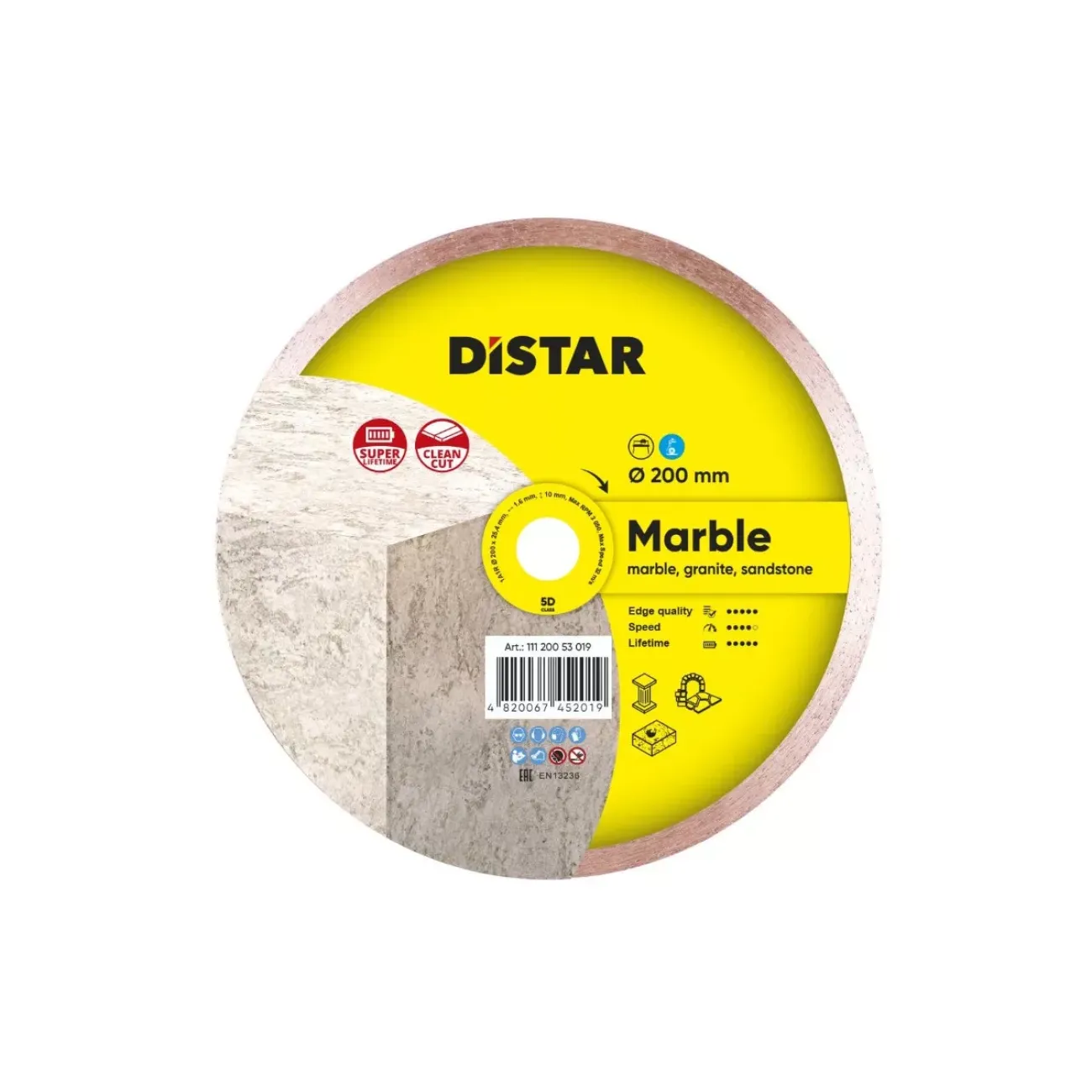 DISTAR 1A1R MARBLE ադամանդե սկավառակը ներկայացված է միջին գնային կատեգորիայում որպես կոշտ բնական նյութերի թաց կտրման ունիվերսալ սկավառակ։ Մասնավորապես, այն օգտագործվում է բոլոր տեսակի մարմարի, տրավերտինի և դոլոմիտի մշակման համար՝ առանց եզրը կտրելու։