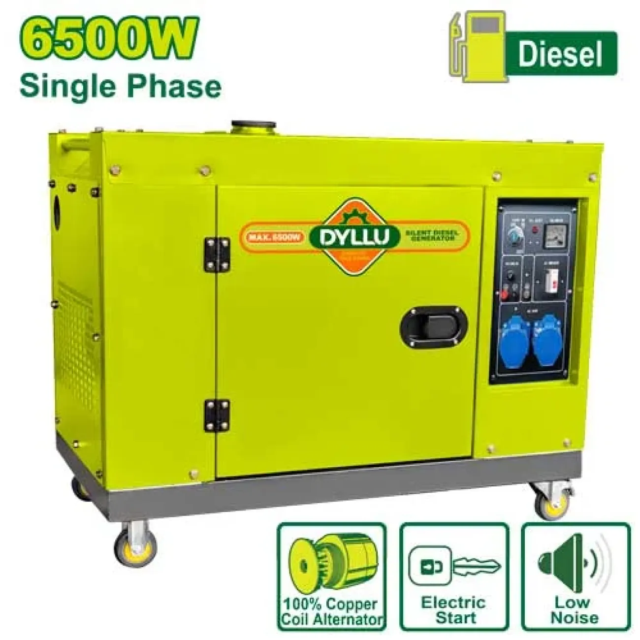 Անաղմուկ դիզելային գեներատոր (մեկնարկիչով) 6500 Վտ Dyllu DTDG2A80Գնահատված լարումը` 220-240 Վ:Գնահատված հաճախականությունը՝ 50 Հց:Միաֆազ:Առավելագույն հզորությունը՝ 6.5 կՎտ:Գնահատված հզորությունը՝ 6,0 կ...