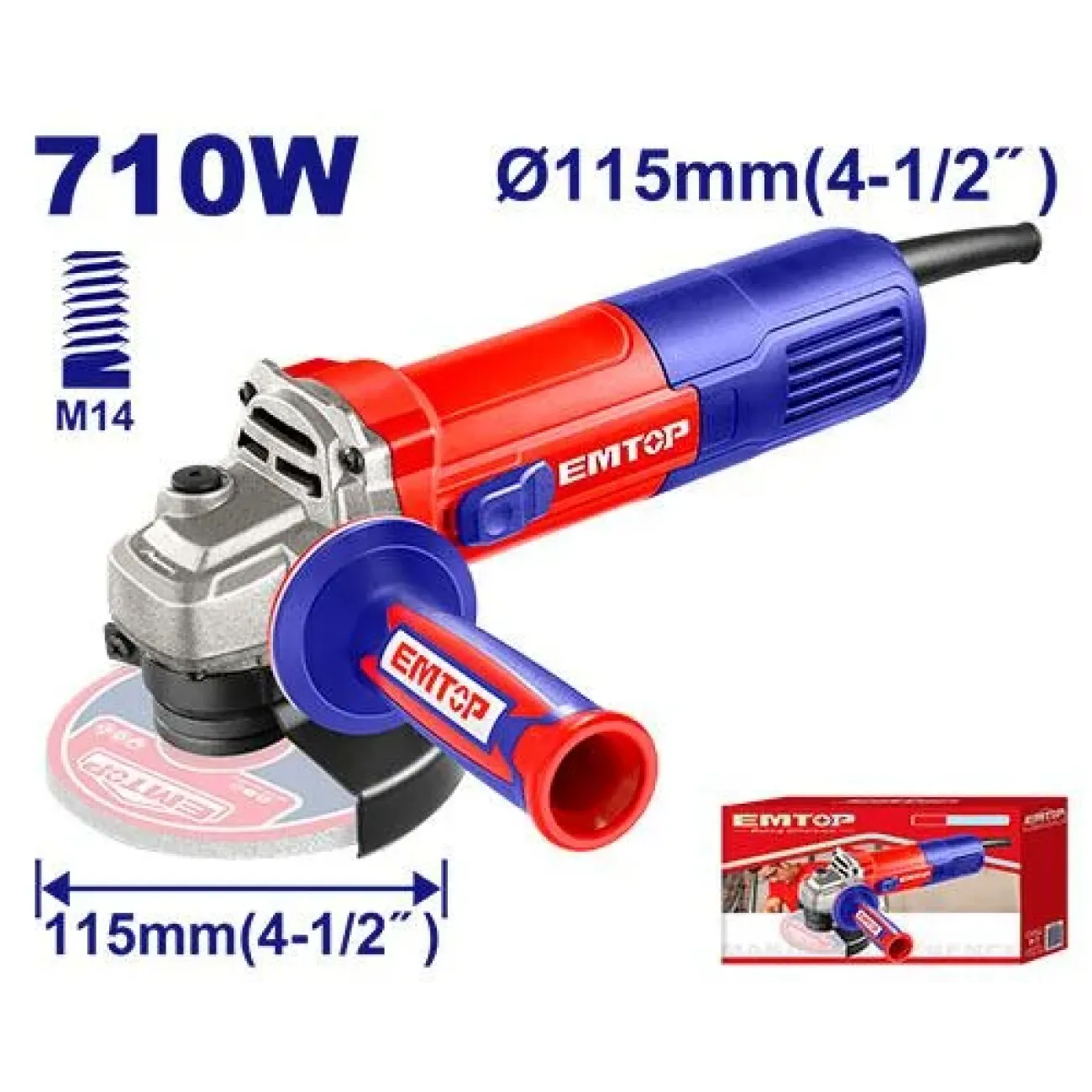 Անկյունային Հղկող Մեքենա - Բալգարկա EMTOP EAGR17181Լարման: 220-240վ ~ 50/60 հց:Մուտքային հզորությունը՝ 710 Վտ:Պարապ արագությունը՝12000 Պտ/ր:Սկավառակի տրամագիծը ՝ 115 մմ:Առանցքի պարույրի չափ՝ M14:Օժանդակ բռնակ՝...