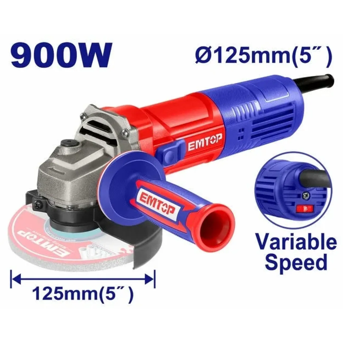 EMTOP EAGRS09051 անկյունային հղկող մեքենան հուսալի և հզոր գործիք է՝ նախատեսված մետաղի, քարի և այլ կարծր նյութերի հղկման և կտրելու համար։ Սարքը հագեցած է 900 Վտ հզորությամբ շարժիչով և 125 մմ սկավառակի տրամաչափով, ինչը ապահովում է բարձր արտադրողականություն։