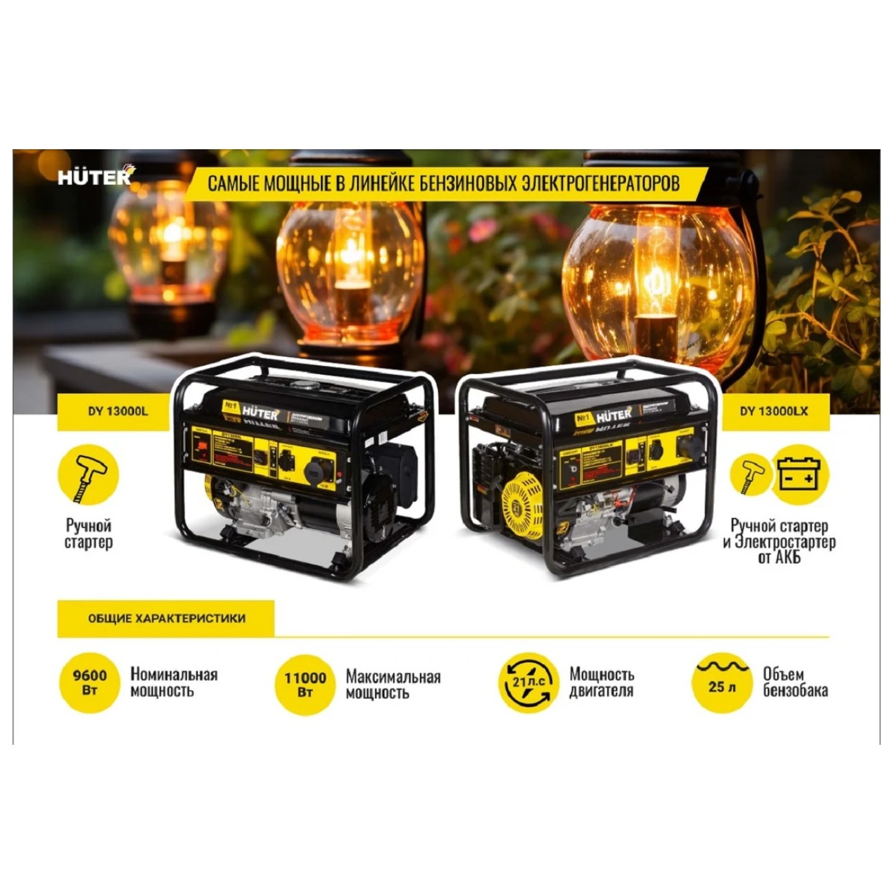 Հիմնական բնութագրերը Բենզինային գեներատոր (մեկնարկիչով) 11000 Վտ Huter DY13000LX