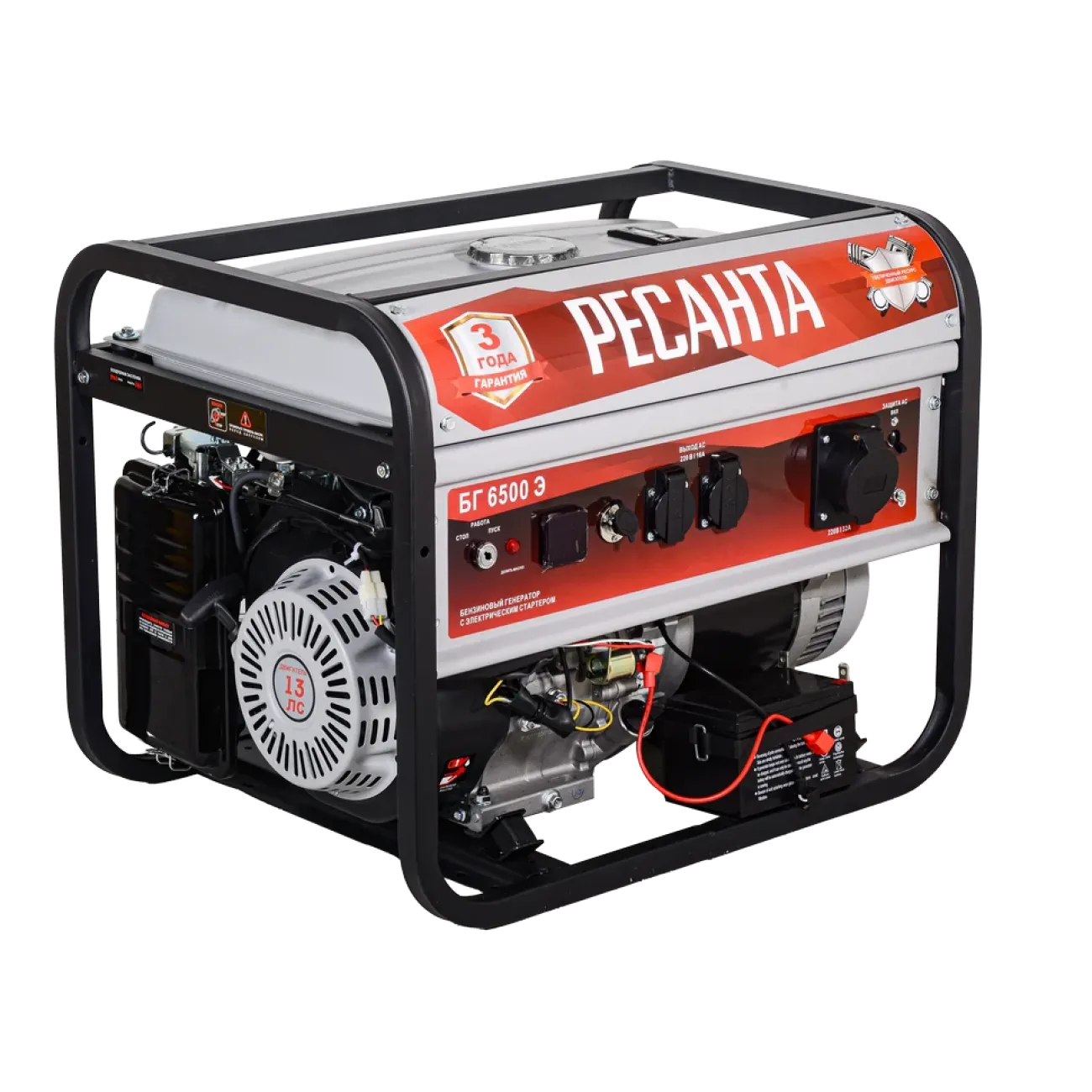 Resanta BG 6500E էլեկտրական գեներատորը՝ առավելագույնը 5500 Վտ հզորությամբ և 13 ձիաուժ հզորությամբ բենզինային շարժիչով, ապահովում է ինքնավար էներգիա կենցաղային տեխնիկայի և մասնագիտական սարքավորումների համար ժամանակավոր կամ լրիվ էլեկտրաէներգիայի անջատման դեպքում։