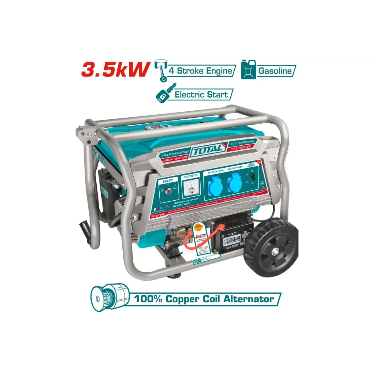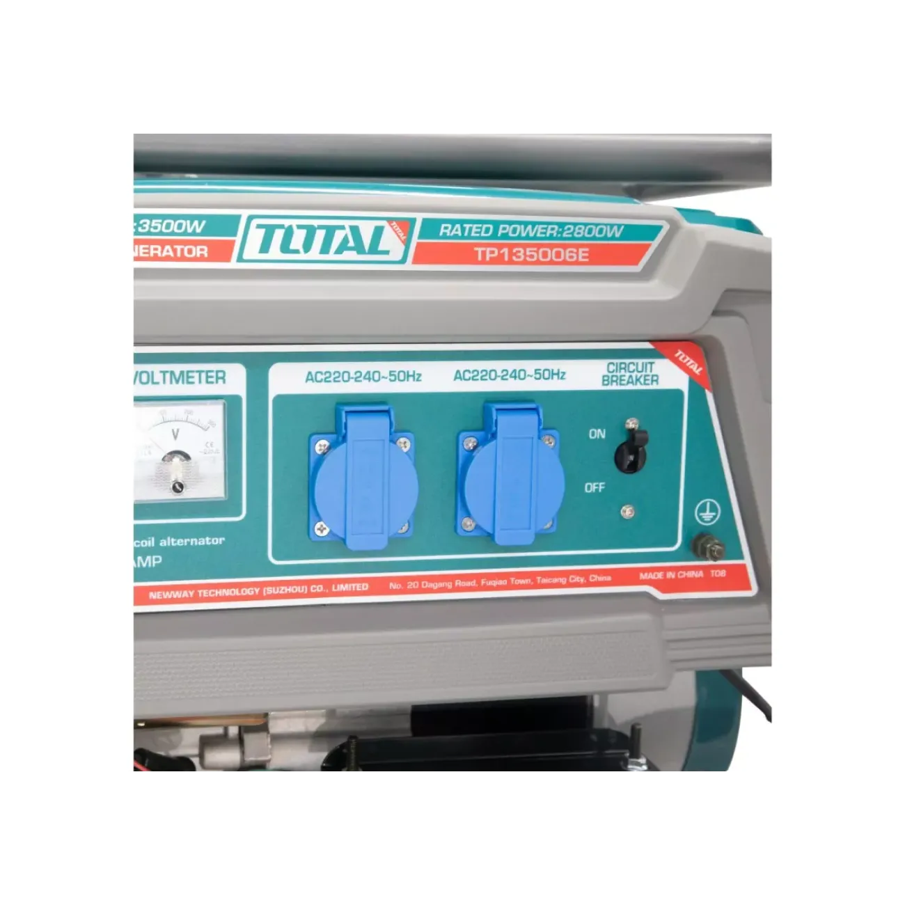 Գեներատոր TOTAL TP135006E նախատեսված է էլեկտրամատակարարման համար: Հագեցած է ECU համակարգով՝ լարման կայունացման և որակյալ հոսանքի ապահովման համար: Աշխատում է ԱԻ-92 բենզինով, ունի մեծացված վառելիքի բաք՝ մակարդակի ցուցիչով և արդյունավետ հովացման համակարգ: Ապահովում է միաֆազ 220 Վ ելք և 50 Հց հաճախականություն: