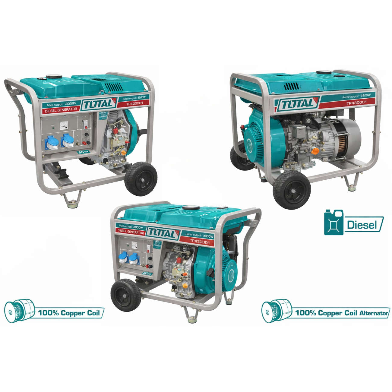 TOTAL TP430001 դիզելային գեներատորը 3000 Վտ հզորությամբ հուսալի լուծում է տան, արհեստանոցի կամ շինհրապարակի պահուստային էլեկտրամատակարարման համար: Հագեցած է 4-տակտային դիզելային շարժիչով, AVR լարման կայունացման համակարգով և հարմար կառավարման վահանակով: Կոմպակտ դիզայնը, անիվները և բռնակները ապահովում են հեշտ տեղաշարժը: Գեներատորն առանձնանում է վառելիքի խնայողությամբ, աղմուկի ցածր մակարդակով և կայուն աշխատանքով նույնիսկ երկարատև շահագործման դեպքում: