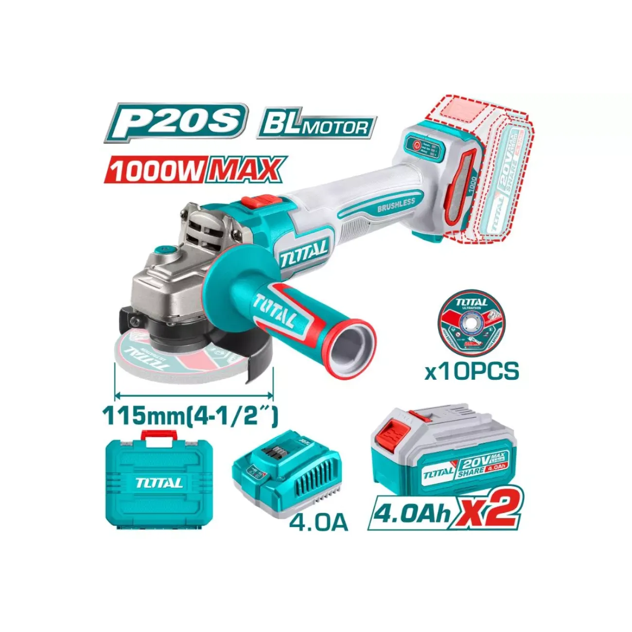 Կոմպլեկտում 2 հատ 4.0 Ah վերալիցքավորվող մարտկոց (TFBLI2002): Լիցքավորիչ - 1 հատ (TFCLI2001): Լիցքավորման լարումը ' 220-240V ~ 50 / 60Hz: 1 հավաքածու հղկող սկավառակ մետաղի կտրման համար (10 հատ): Փաթեթավորված է պլաստիկ տուփի մեջ: