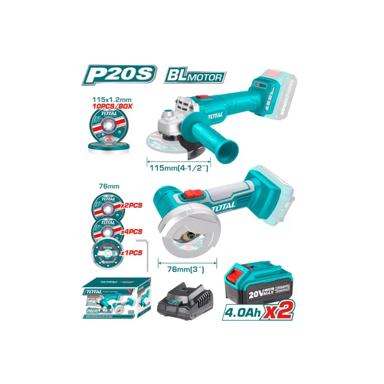 - Հավաքածուն ներառում է՝ 2 հատ մարտկոց, 1 հատ լիցքավորիչ, 10 հատ 115 մմ․ սկավառակ, 4 հատ 76 մմ․ սկավառակ, 4 հատ հղկող սկավառակ 76 մմ․, 1 հատ Hex բանալի ։