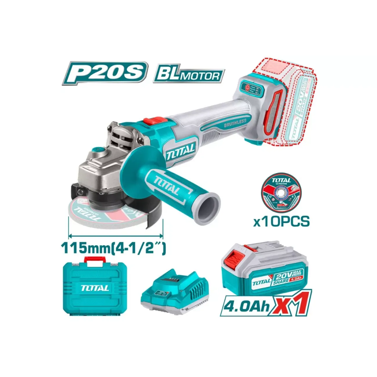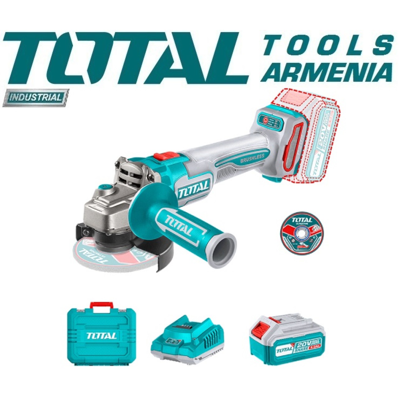 - Մարտկոցով աշխատող անկյունային հղկող մեքենա TOTAL TAGLI211541 - ը օգտագործում է 20 Վ մարտկոց, ինչը թույլ է տալիս աշխատել ավելի արագ և հարմարավետ :