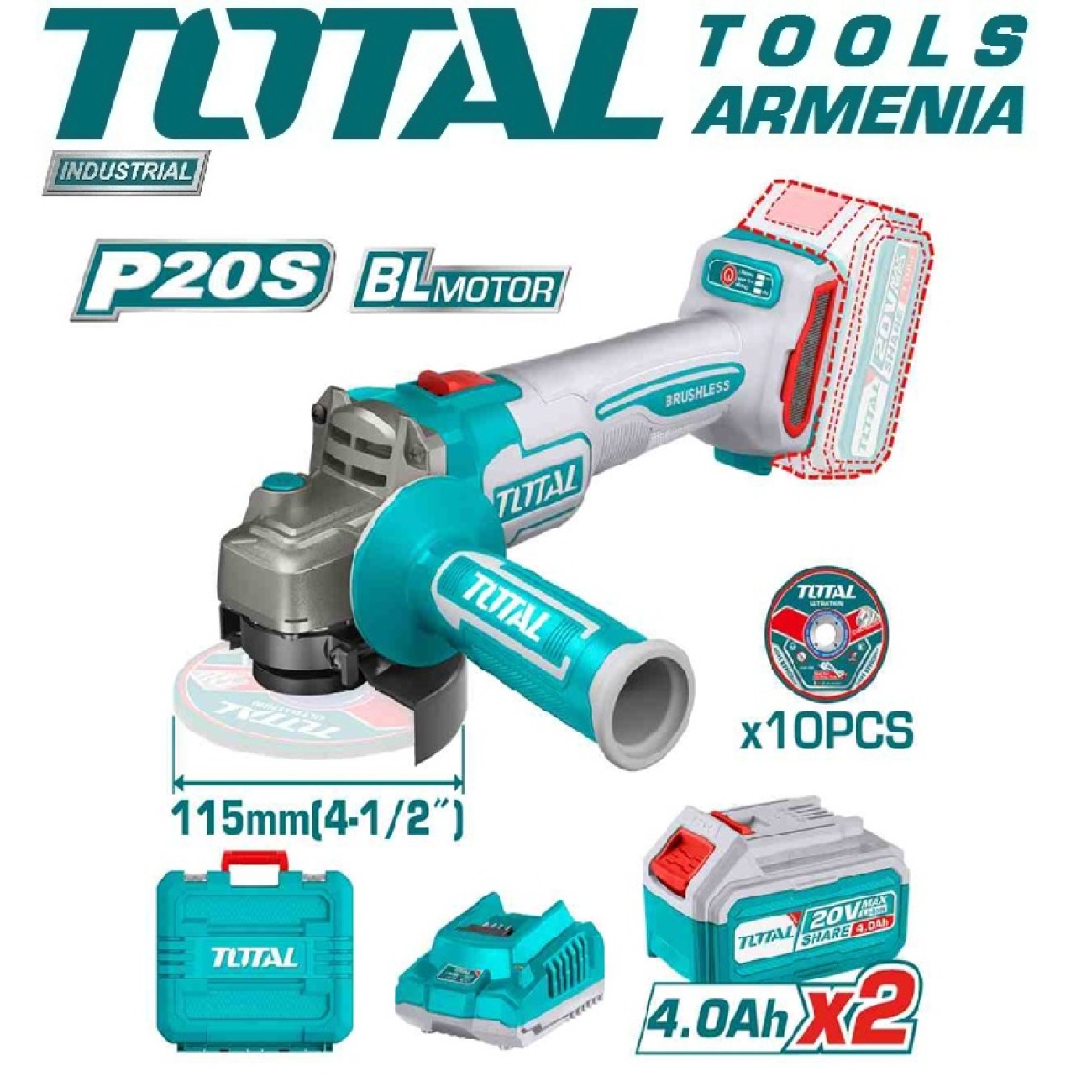 - Մարտկոցով աշխատող անկյունային հղկող մեքենա TOTAL TAGLI211542 - ը օգտագործում է 20 Վ մարտկոց, ինչը թույլ է տալիս աշխատել ավելի արագ և հարմարավետ :