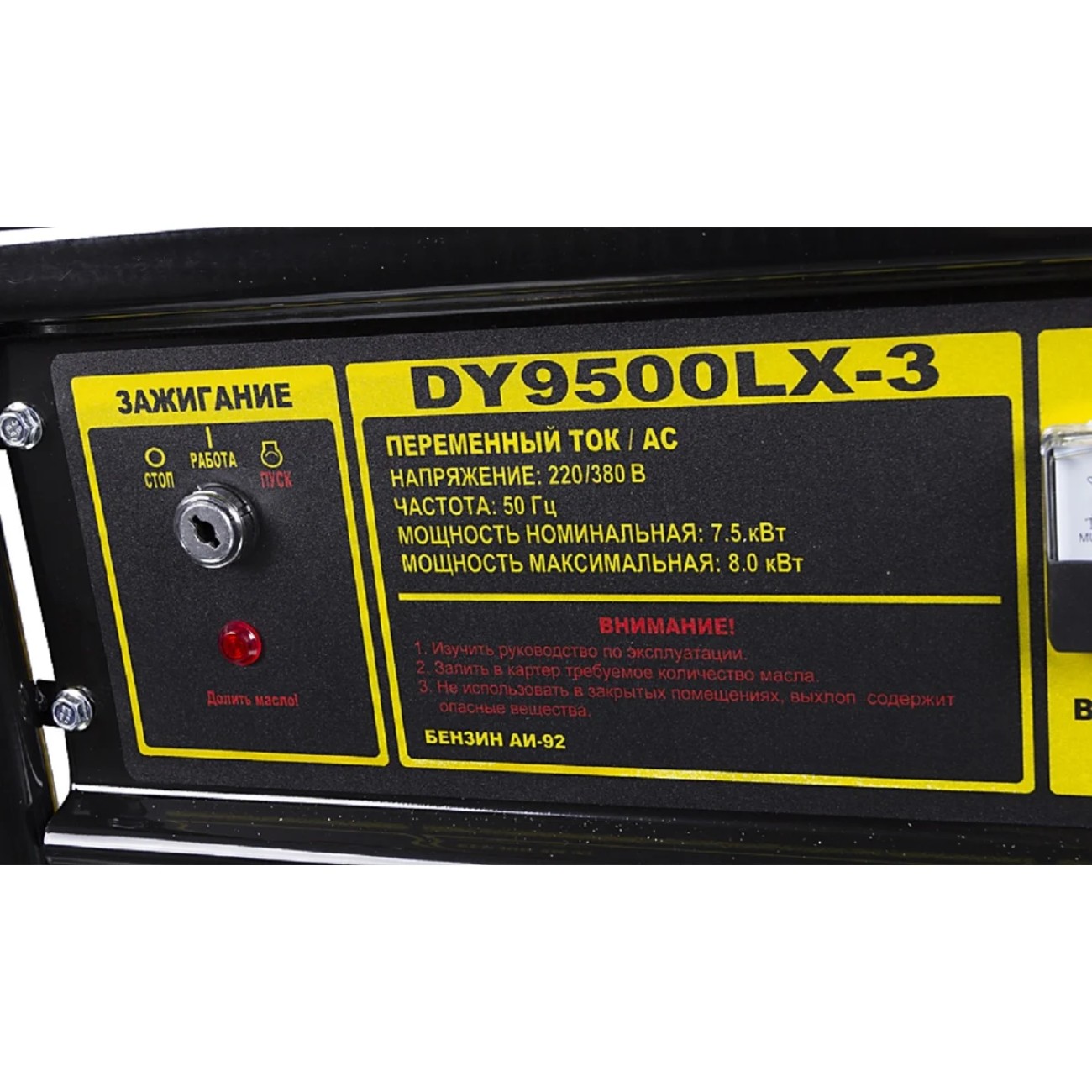Генераторная установка состоит из мощного четырехтактого одноцилиндрового бензинового двигателя и электрической машины (альтернатор), преобразующей механическую энергию - в электрическую. Смазка осуществляется разбрызгиванием масла в картере. Пуск двигателя в модели DY9500LX-3 осуществляется с помощью электростартера. Предусмотрены две защищенные от пыли и влаги розетки для подключения приборов.