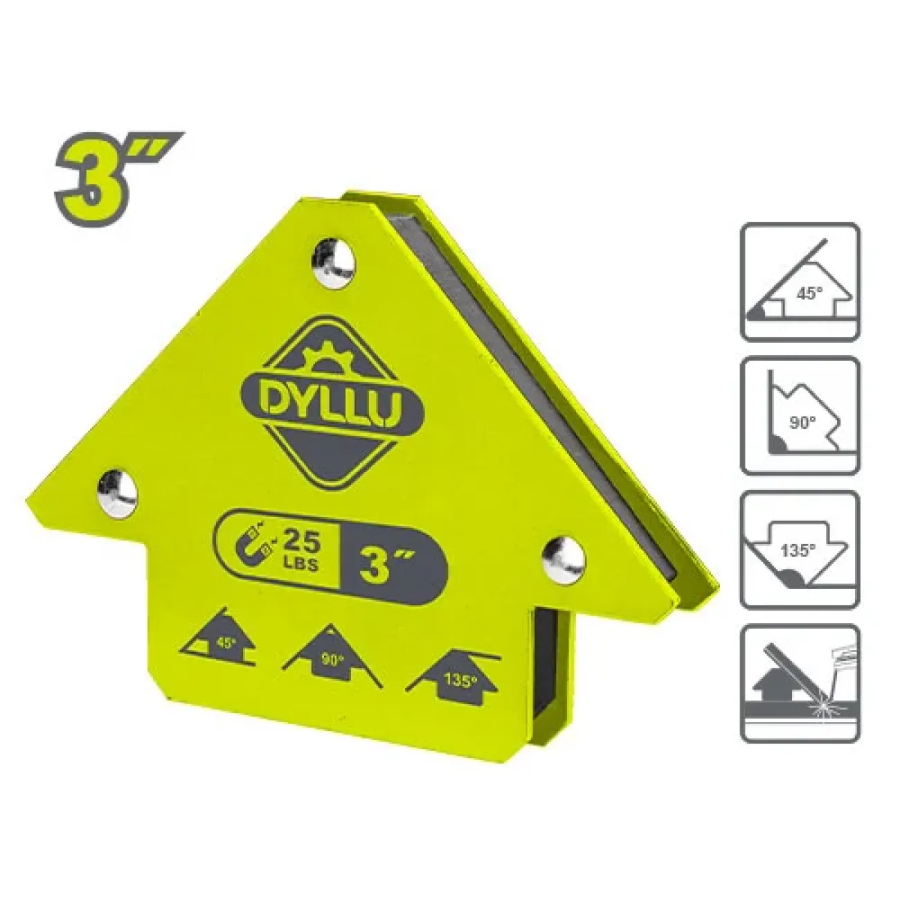 Magnetic Welding Holder. Specifications:3"". Pull Force: 25 Lbs. Product Dimensions:120*83*14.4mm. Angles: 45°,90°,135°. Material: Magnet and Steel. Packed by sliding card.