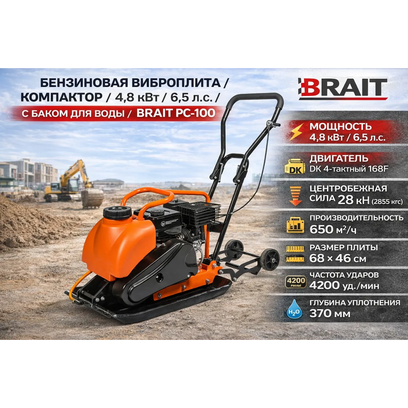 BRAIT PC-100 վիբրոպլիտան նախատեսված է հողի, ավազի և մանրախիճի խտացման համար։ Հարմար է շինարարական և ճանապարհաշինարարական աշխատանքների, ինչպես նաև սալիկապատման և հիմքերի պատրաստման համար։ Սարքը ապահովում է բարձր խտացման արդյունավետություն նեղ տարածքներում և կայուն աշխատանք՝ նույնիսկ կոշտ հողերի վրա։