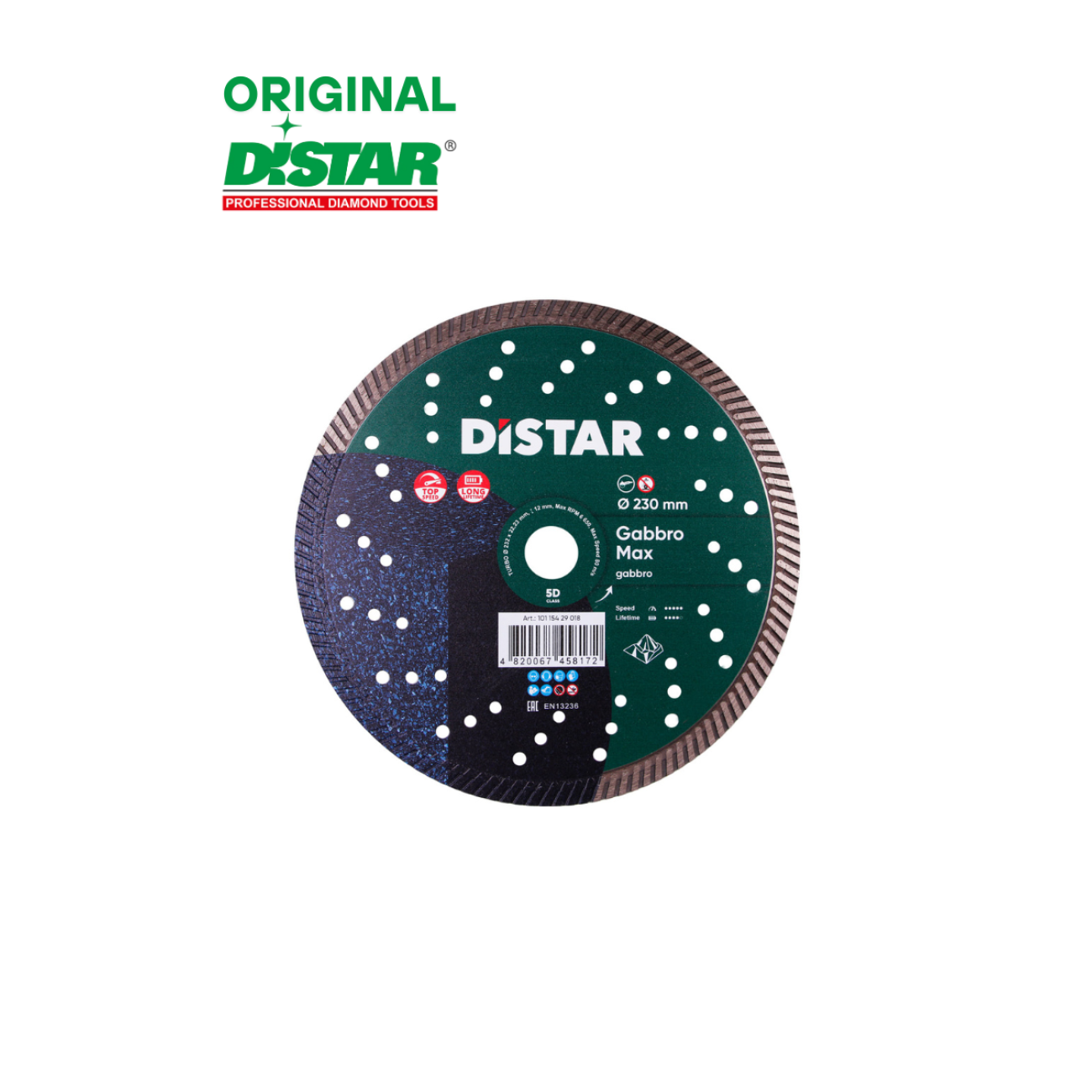 Distar Gabbro MAX 230 մմ գրանիտ կտրող տուրբո սկավառակ ՝ 12 մմ ադամանդե շերտի բարձրությամբ, կիրառվում է 230 մմ ԱՀՄ (Բալգարկա) ի վրա ՝ 22.2 մմ ստանդարտ տեղավորմամբ: