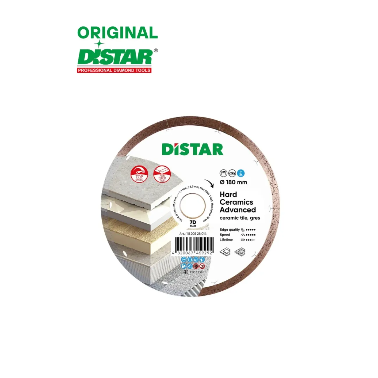HARD CERAMICS ADVANCED ադամանդե սկավառակը հատուկ նախագծված է հաստ և դիմացկուն ճենապակյա քարե սալիկների կտրման համար։ Սկավառակի ադամանդե շերտը ներառում է գրաֆիտային չիպսեր, որոնք ստեղծում են միկրոծակոտկեն կառուցվածք և գործում են որպես պինդ քսանյութ։ Ադամանդե շերտը ենթարկվում է լազերային սեգմենտացիայի՝ նվազեցնելով ջերմային բեռների ազդեցությունը սկավառակի վրա։