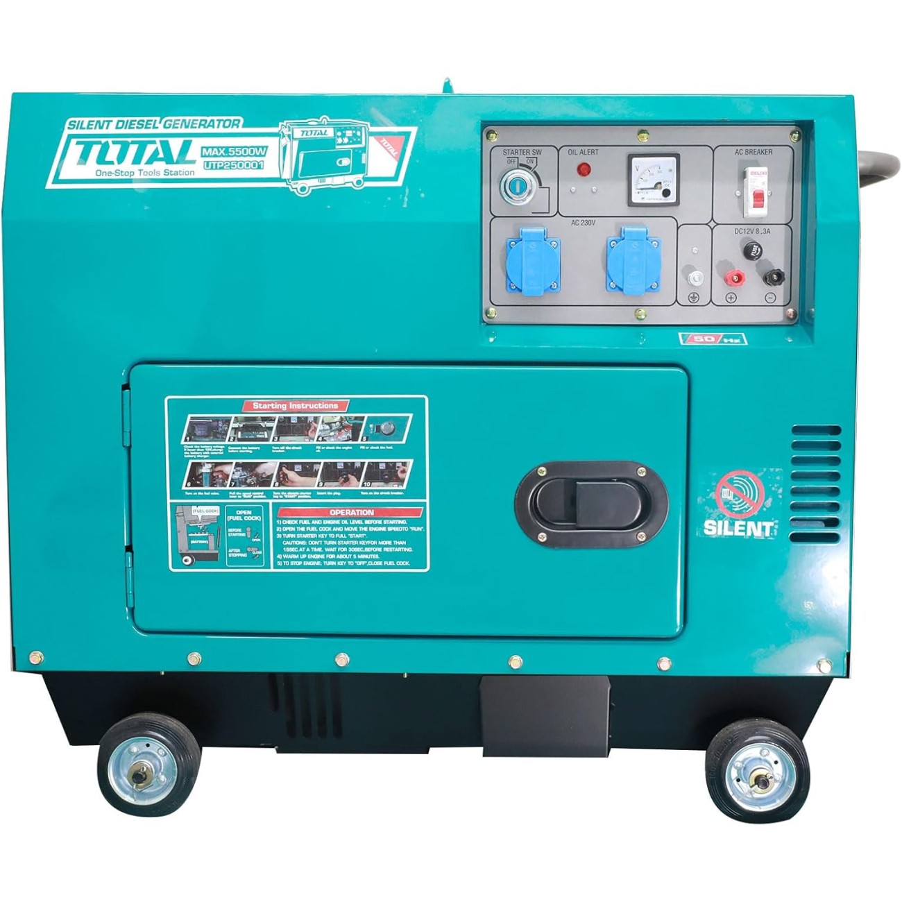 TOTAL TP250001-1 (անաղմուկ) դիզել-գեներատորը տան, ամառանոցի կամ շինհրապարակի էլեկտրամատակարարման հուսալի պահեստային աղբյուր է: Սարքն առանձնանում է էլեգանտ դիզայնով, շահագործման հեշտությամբ և բարձր երկարակեցությամբ: 172 կգ քաշի, ինչպես նաև տեղափոխման համար անիվների և բռնակի առկայության շնորհիվ գեներատորը հարմար է տեղափոխել և օգտագործել տարբեր պայմաններում: Ամբողջական կառավարման վահանակը հագեցած է փոփոխական հոսանքի ավտոմատ անջատիչով և անալոգային վոլտմետրով: AVR (լարման ավտոմատ կարգավորիչ) համակարգը ապահովում է ելքային լարման ճշգրիտ վերահսկում և կայունություն: Սպասարկում չպահանջող մարտկոցը և կոմպակտ դիզայնը գեներատորի օգտագործումը դարձնում են առավել հարմարավետ: Էլեկտրամատակարարման ընդհատումների դեպքում սարքը երաշխավորում է տան լուսավորությունը և հիմնական կենցաղային տեխնիկայի՝ թեյնիկի, սառնարանի, ջեռուցիչի և այլնի աշխատանքը: Շարժիչն աշխատում է սահուն, աղմուկի ցածր մակարդակով, հեշտությամբ գործարկվում է, առանձնանում է խնայողությամբ և զգայունությամբ: